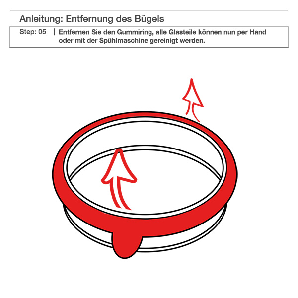 Ersatzgummiringe können Sie jederzeit bei uns bestellen. Temperaturbeständig bis maximal 120° Celsius. - Reinigung: Glasteile und Gummiring sind spülmaschinengeeignet. Dazu demontieren Sie vorher den Drahtbügel. Er würde sich durch die Spülmaschine dunkel verfärben und sieht dann unansehnlich aus. Den Spannbügel nach feuchter (Hand)Reinigung bitte direkt abtrocknen. Das Abnehmen des Spannbügels ist mit wenigen Handgriffen getan.