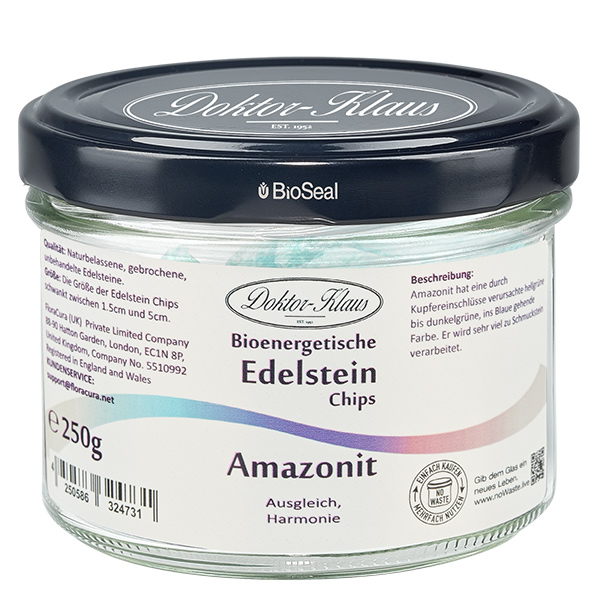 Der Amazonit schenkt Ausgeglichenheit, inneren Frieden und Harmonie. Stimmungsschwankungen verschwinden. Stärkt das Selbstbewusstsein und hilft aus einer Opferhaltung heraus. Hilft bei der Regulierung von Stoffwechselstörungen. Günstig bei Nerven- und Gehirnerkrankungen. Gerne angewandt bei Kopfschmerzen und gegen Schlafstörungen mit Alpträumen. - Inhalt: 250 g naturbelassene Edelstein-Chips.