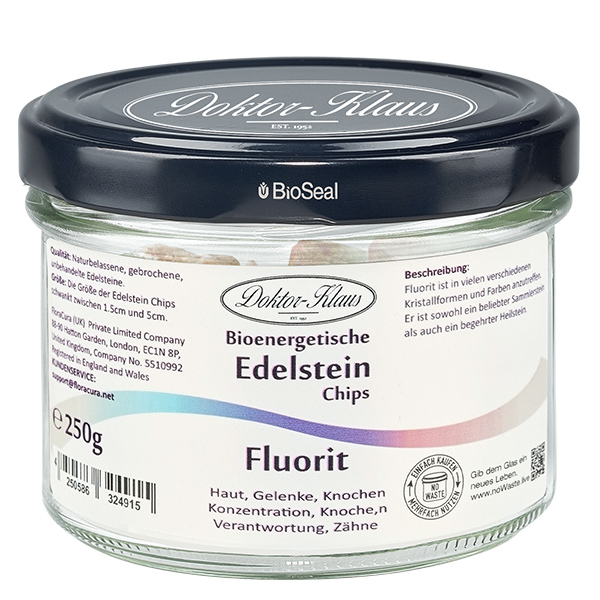 Der Fluorit symbolisiert die Verantwortung gegen uns selbst und gegenüber unseren Mitmenschen. Er verhilft zu mehr Konzentration und fördert die Lernbereitschaft. Er ist gut einzusetzen für die Regeneration der Haut und der Schleimhäute, insbesondere auch die Schleimhäute der Atemwege und der Lunge. Er unterstützt bei Hautunreinheiten, Pickeln und Wunden. Er stärkt Knochen und Zähne und hilft bei Gelenkbeschwerden. Er hält unseren Bewegungsapparat beweglich. Wirkt entschlackend und entgiftend auf die Haut. - Inhalt: 250 g naturbelassene Edelstein-Chips.