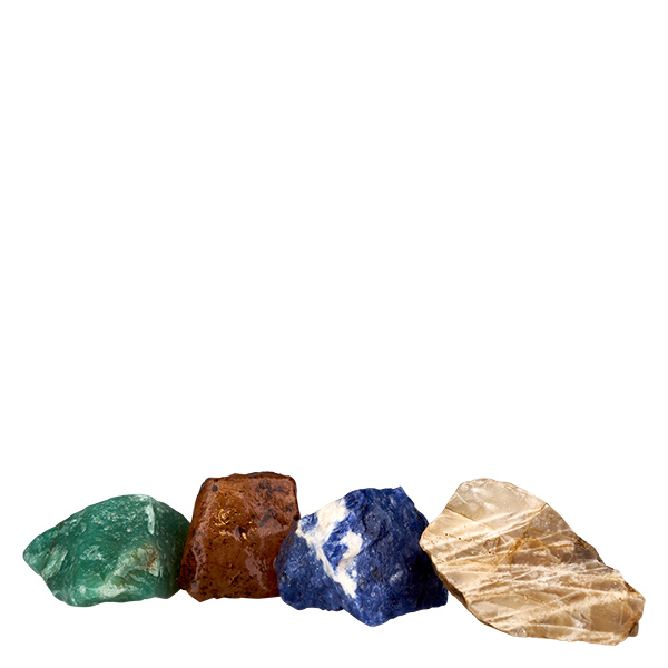 Aventurin (Zufriedenheit und innere Ruhe) - Mondstein (Sanftmut, Einsicht) - Roter Karneol (Erdverbundenheit, Partnerschaft und Lebensfreude) - Sodalith (Selbstbewusstsein und Offenheit)