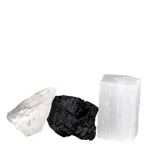 Bergkristall (Klarheit und Energie) - Selenit (Besonnenheit und Ruhe) - Turmalin schwarz (Realitätssinn)