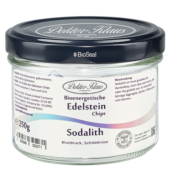 Der Sodalith regt die Schilddrüsenfunktion an, fördert Wachstum und den Stoffwechsel. Dieser Stein aktiviert die Bauchspeicheldrüse und regt die Produktion von Insulin an. Es ist der Stein bei hohem Blutdruck und entlastet das Herz. Der Lymphfluss wird aktiviert, das Immunsystem gestärkt. - Inhalt: 250 g naturbelassene Edelstein-Chips.