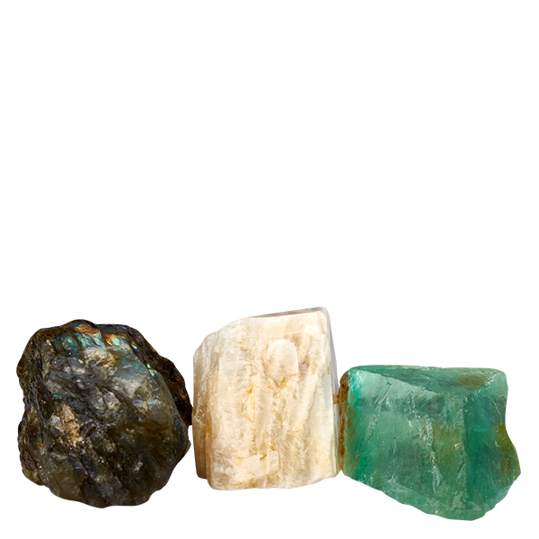 Labradorit (Glück und Kreativität) - Fluorit (Verständnis) - Mondstein (Geduld)