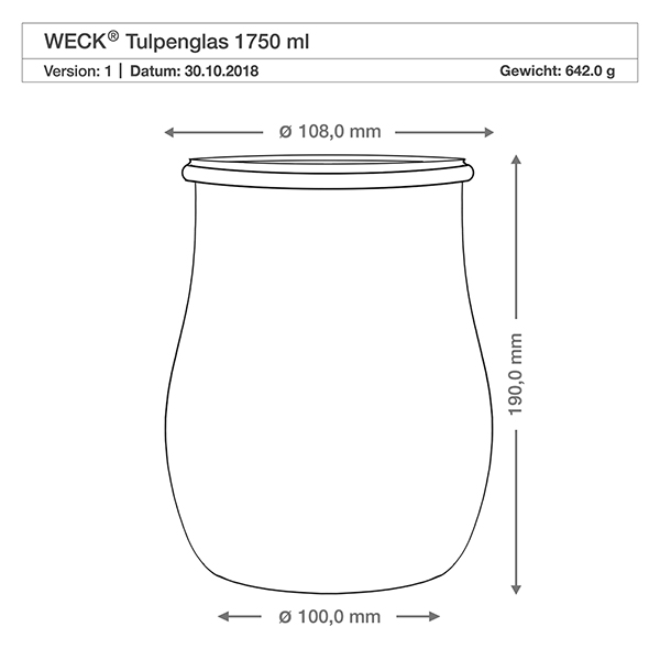 • Ausführung: WECK-Tulpenglas 1750 ml mit Unterteil, Deckel, Gummiring und 2 Klammern.